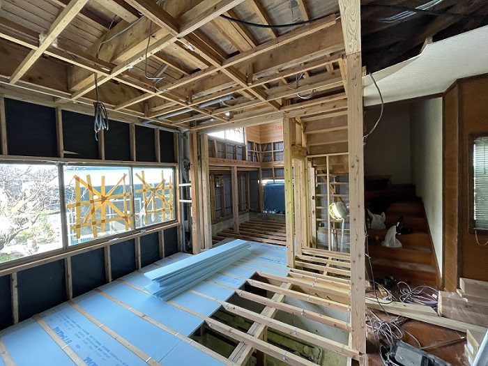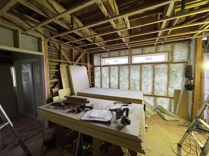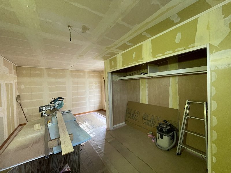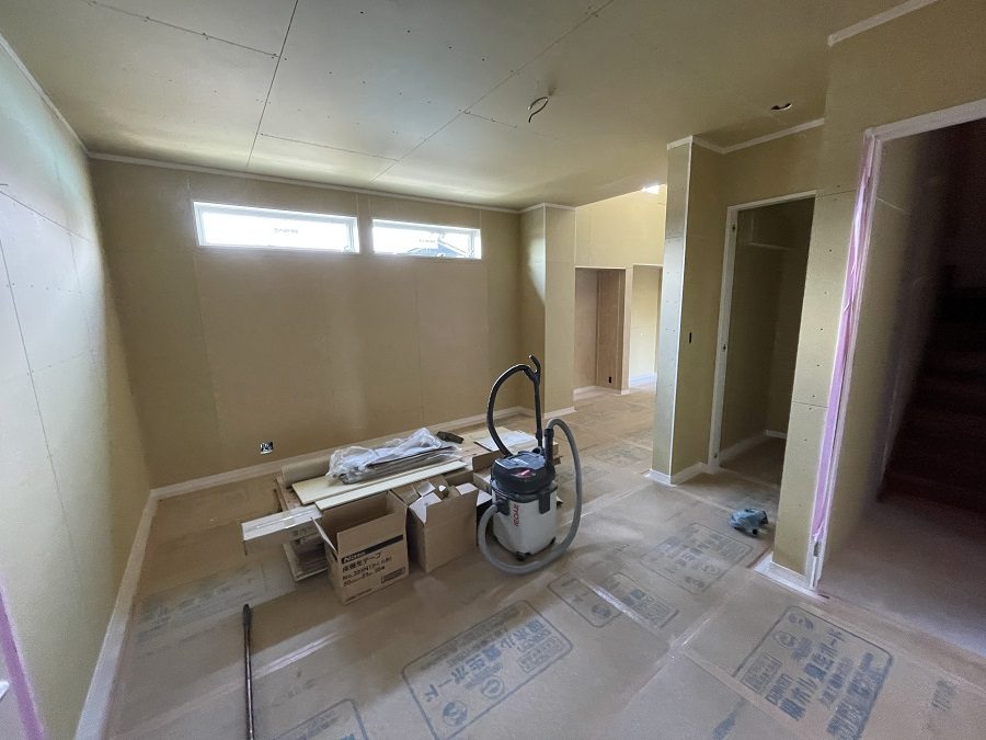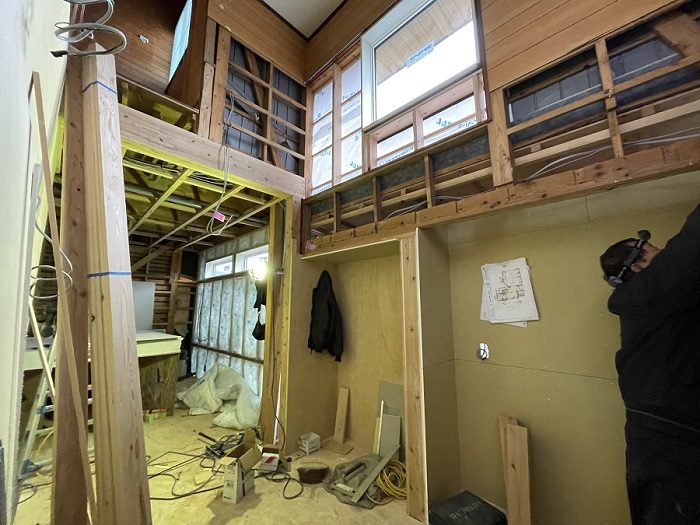 お二階も内装工事、台風の時に心配いらないように小さい窓へ。