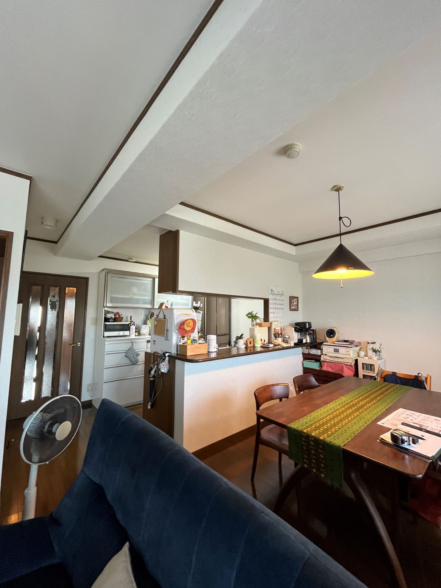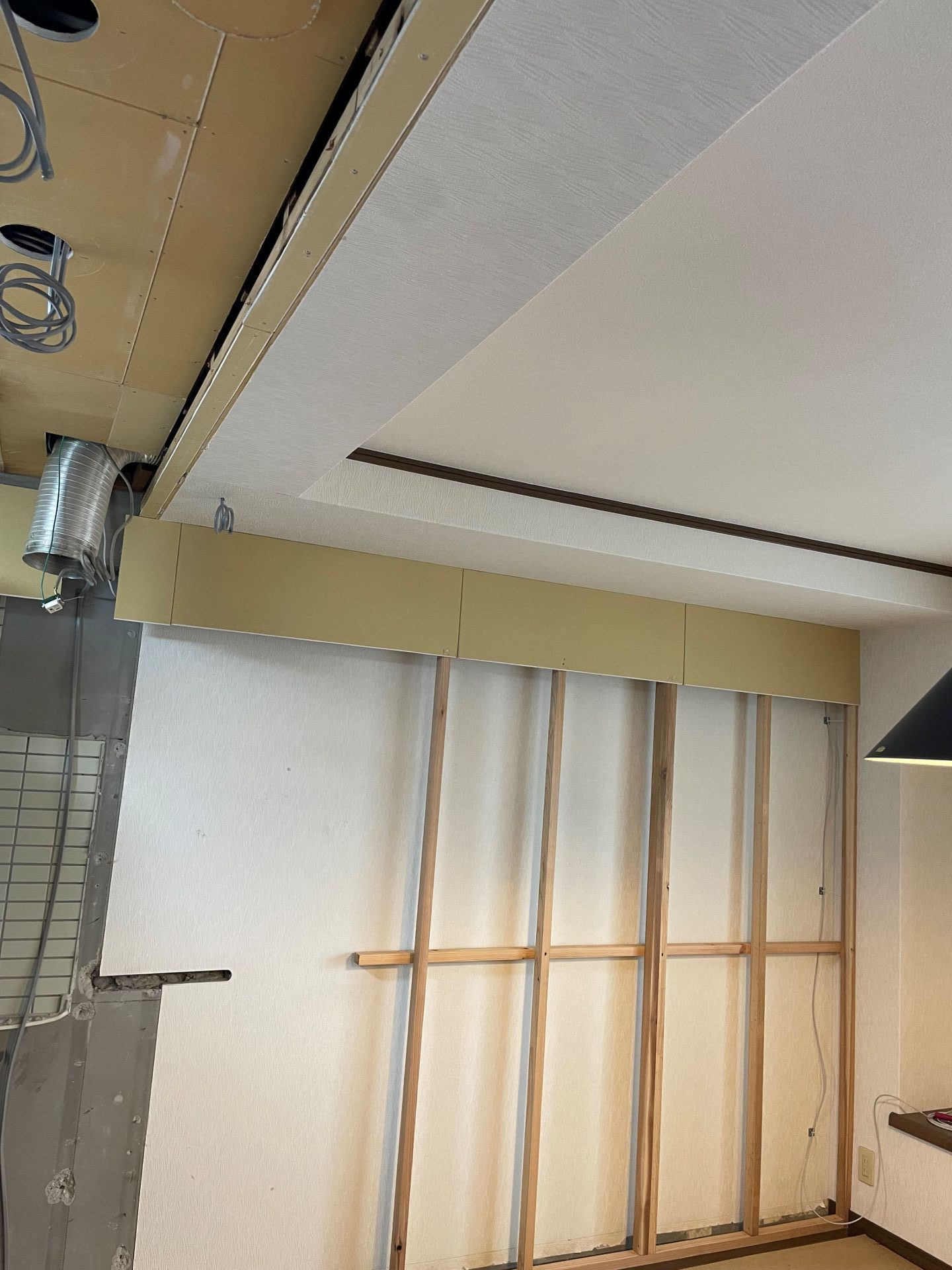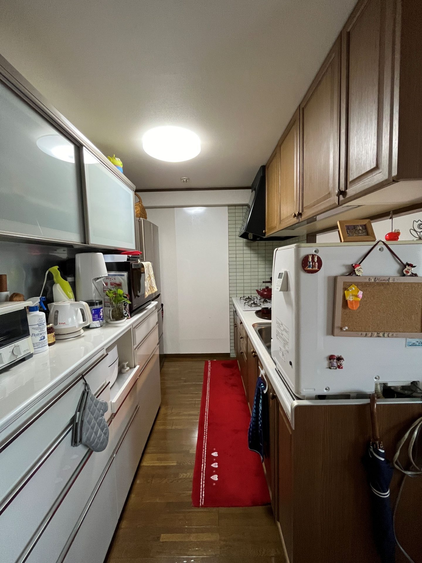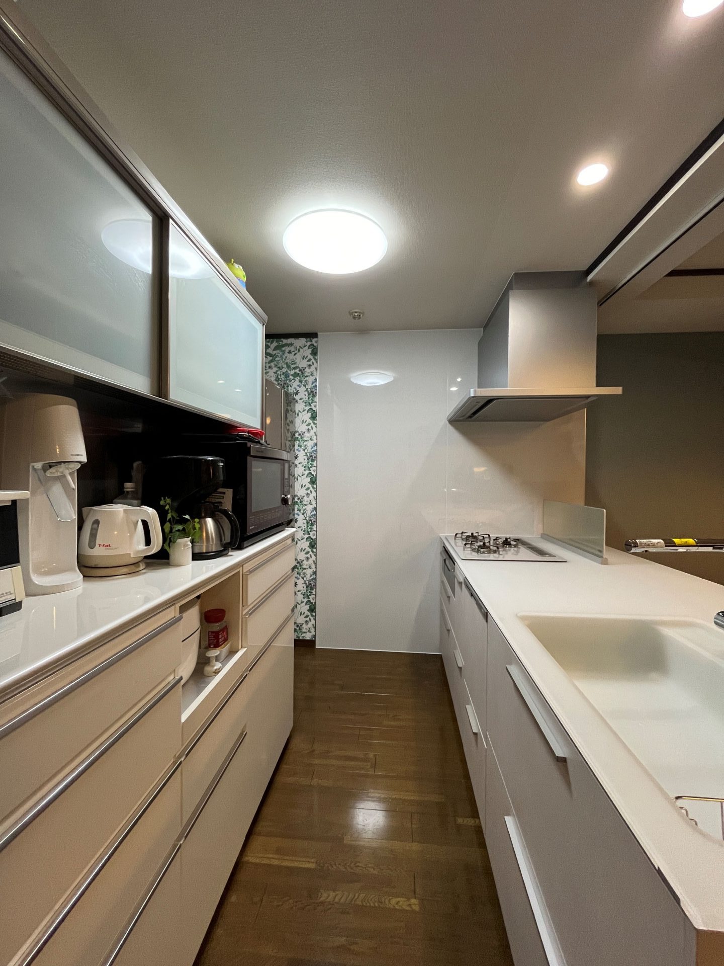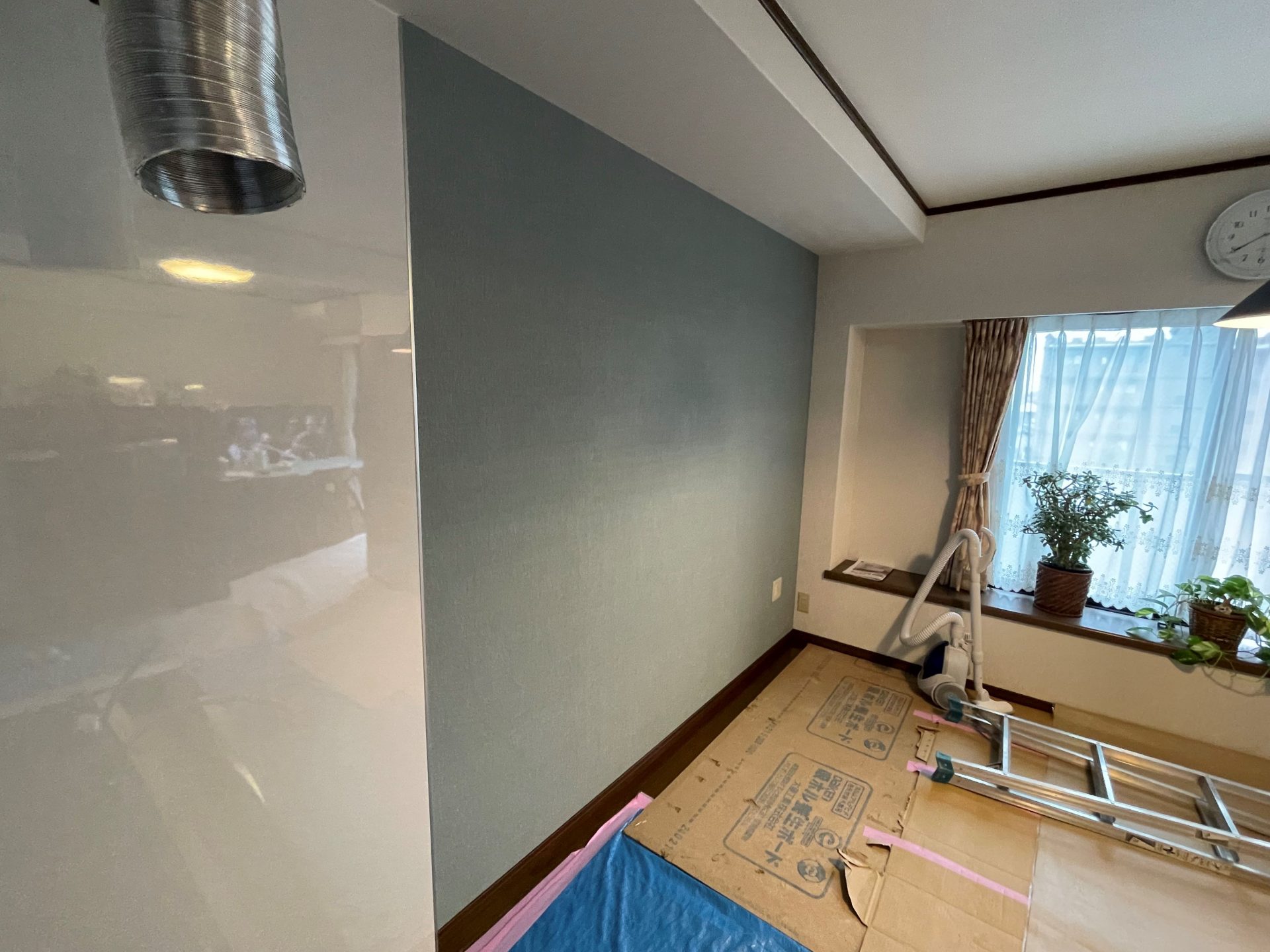 キッチンの色味に合わせて、壁のクロスも変えました。派手過ぎず、白いキッチンに合う淡い緑色のクロスをお選びいただきました(^^)