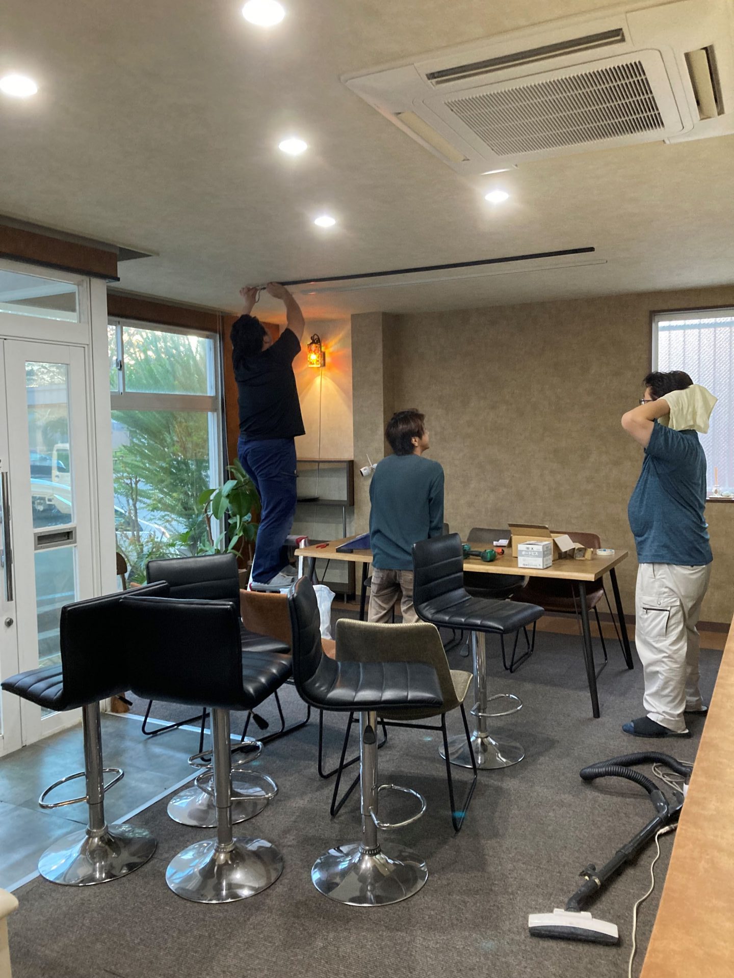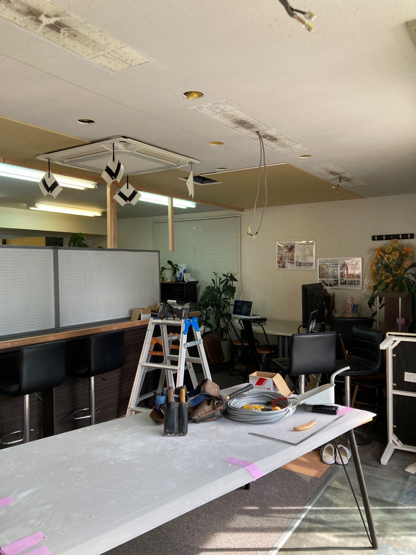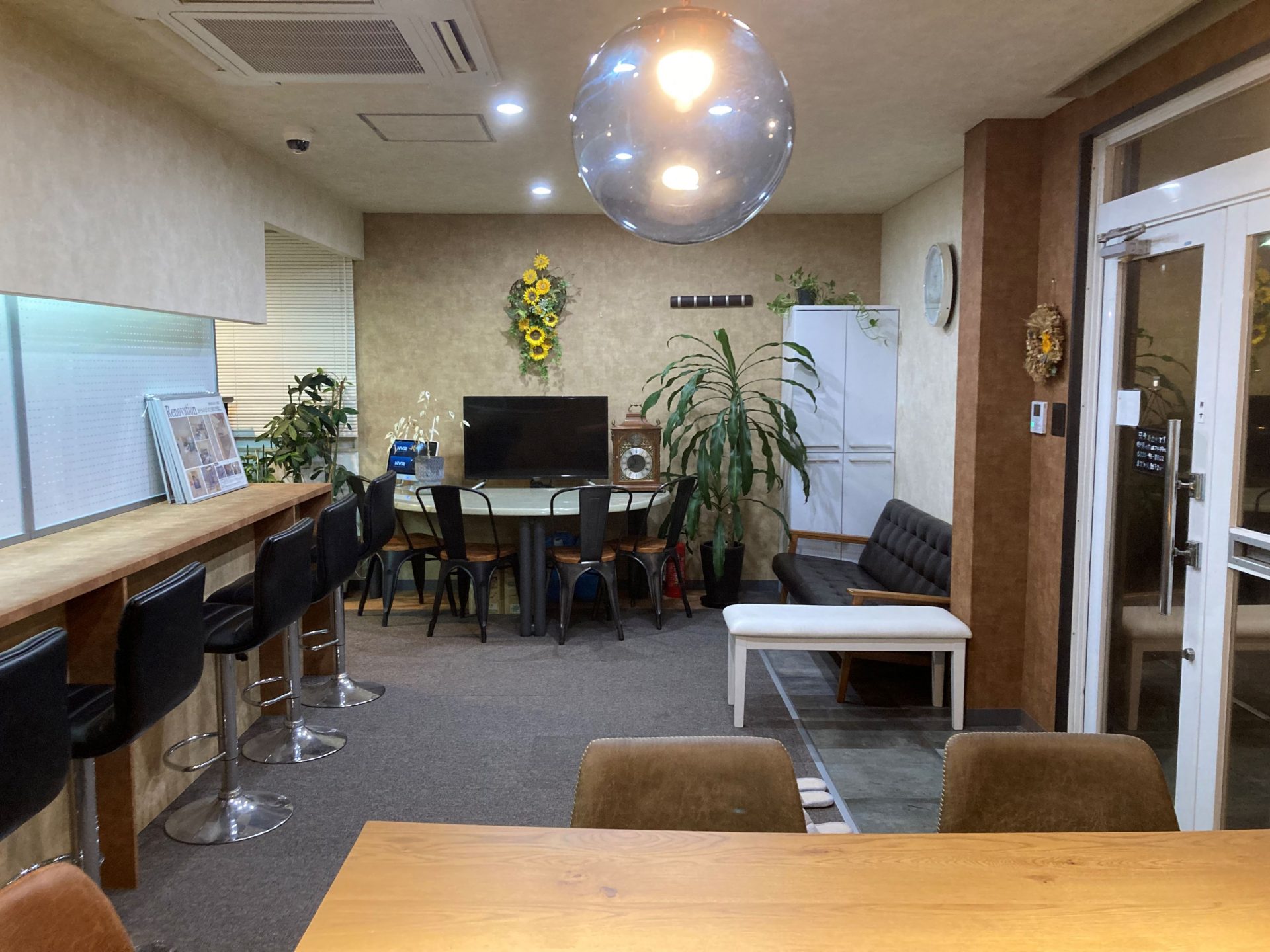 以前から、蛍光灯でザ・事務所という雰囲気からカフェ風の雰囲気に変えたいと思っておりましたので