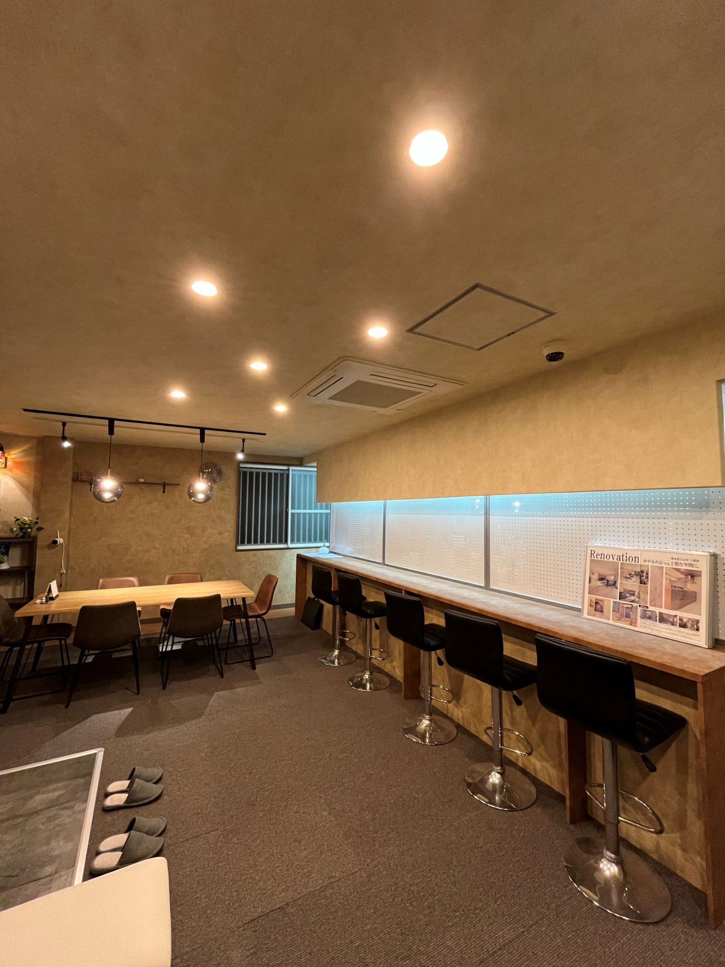 以前から気になっていた蛍光灯をダウンライトに変え、壁と天井のクロスの張り替えを行いました!冬仕様で温かみのあるクロスを選び、落ち着いた雰囲気へ。ペンダントライトもこだわって、大きめの目を引くライトにしました!お客様がご来社の際も以前よりリラックスできる空間となりました!