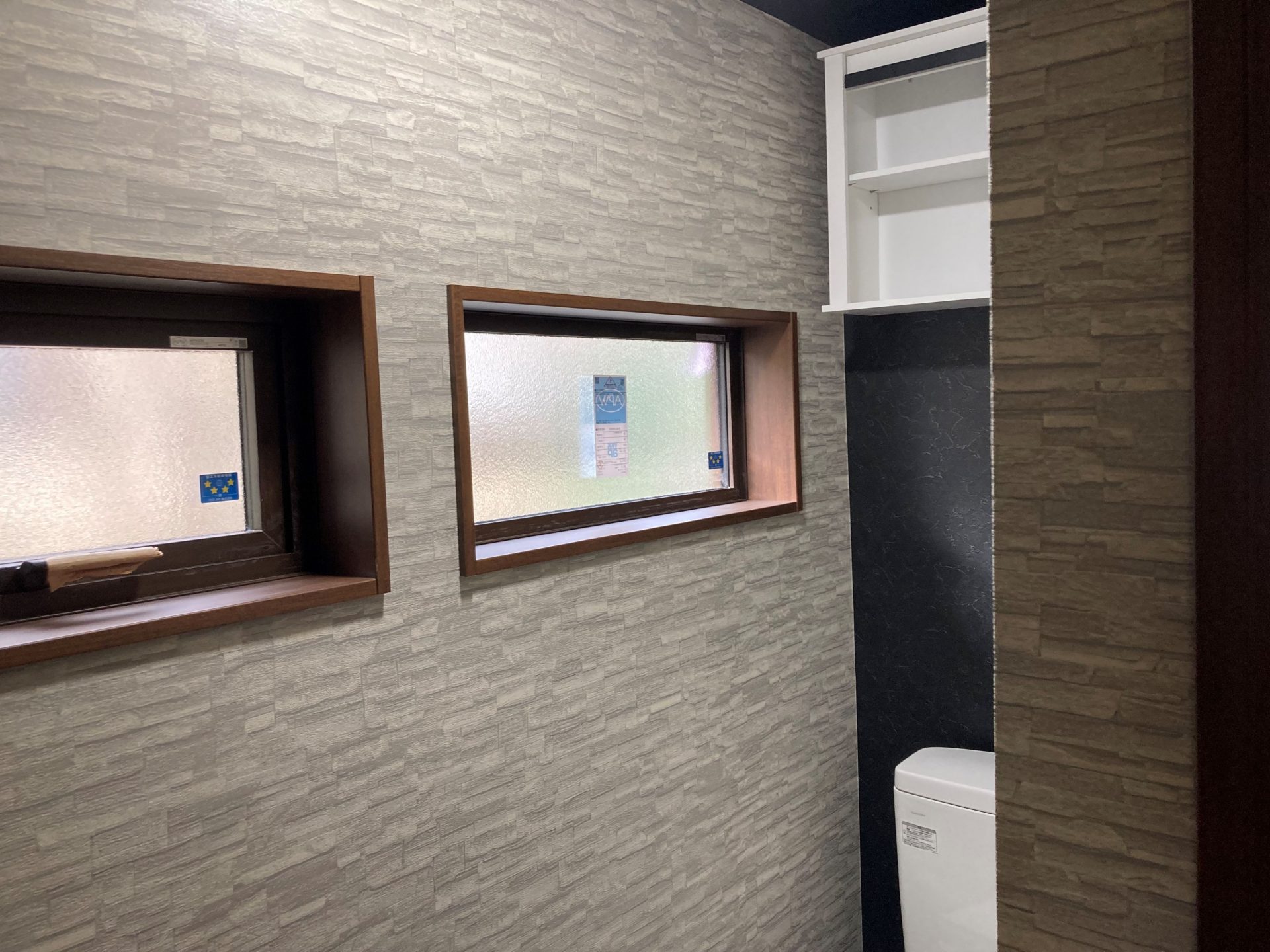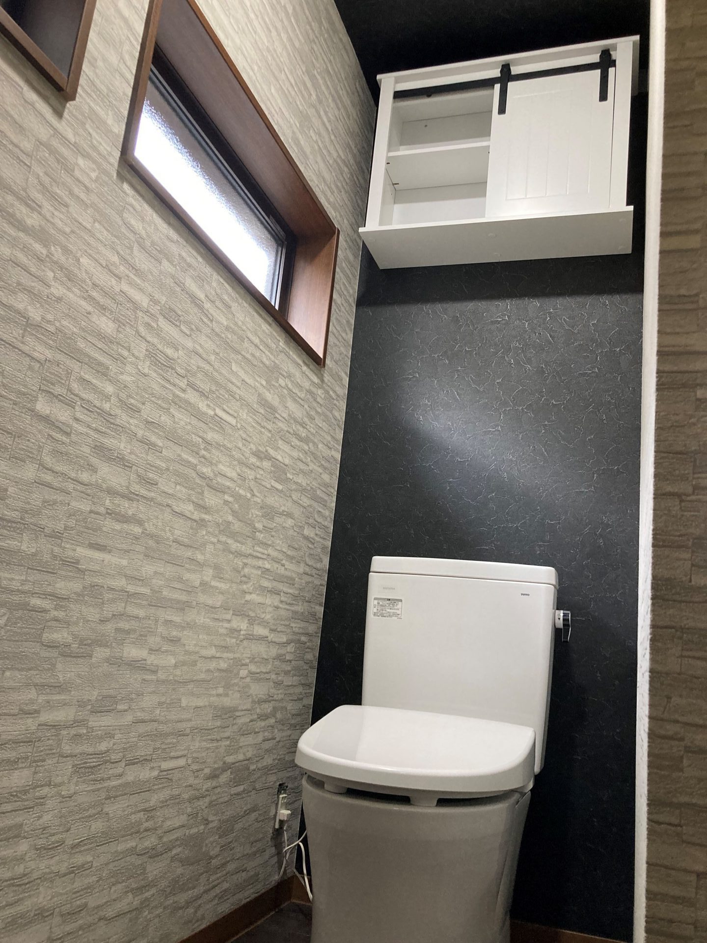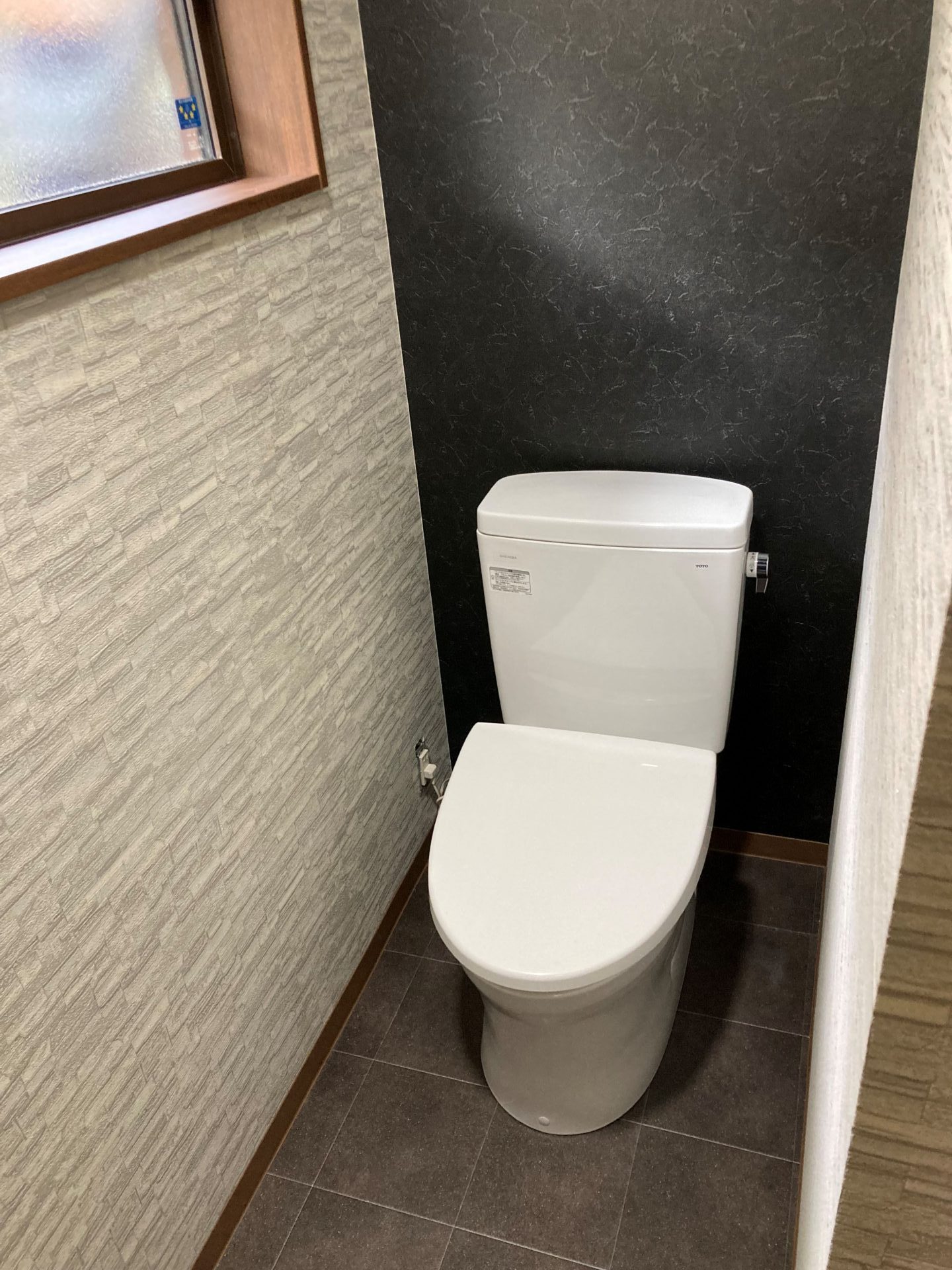 トイレも断熱窓に入れ替えて、寒いタイル壁から断熱材を入れクロス仕上げにしました!内装はN様がカッコいい&お洒落な雰囲気のクロスをお選びいただきました。トイレはTOTOピュアレストQRを採用しています。