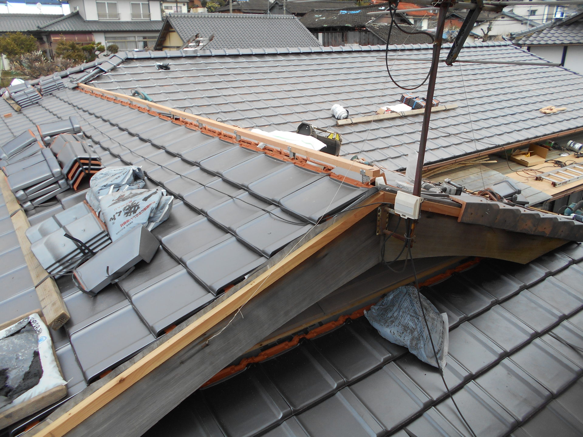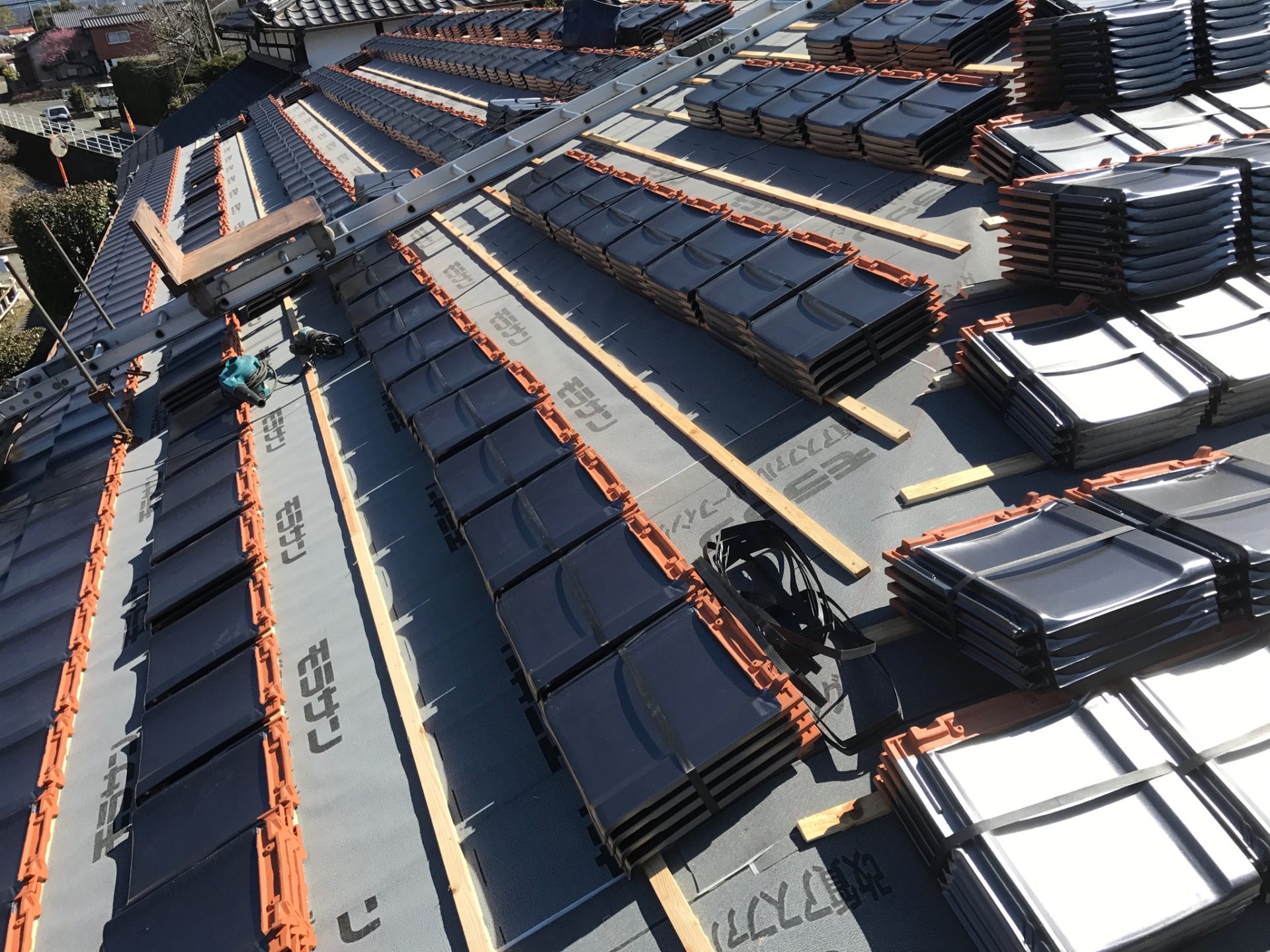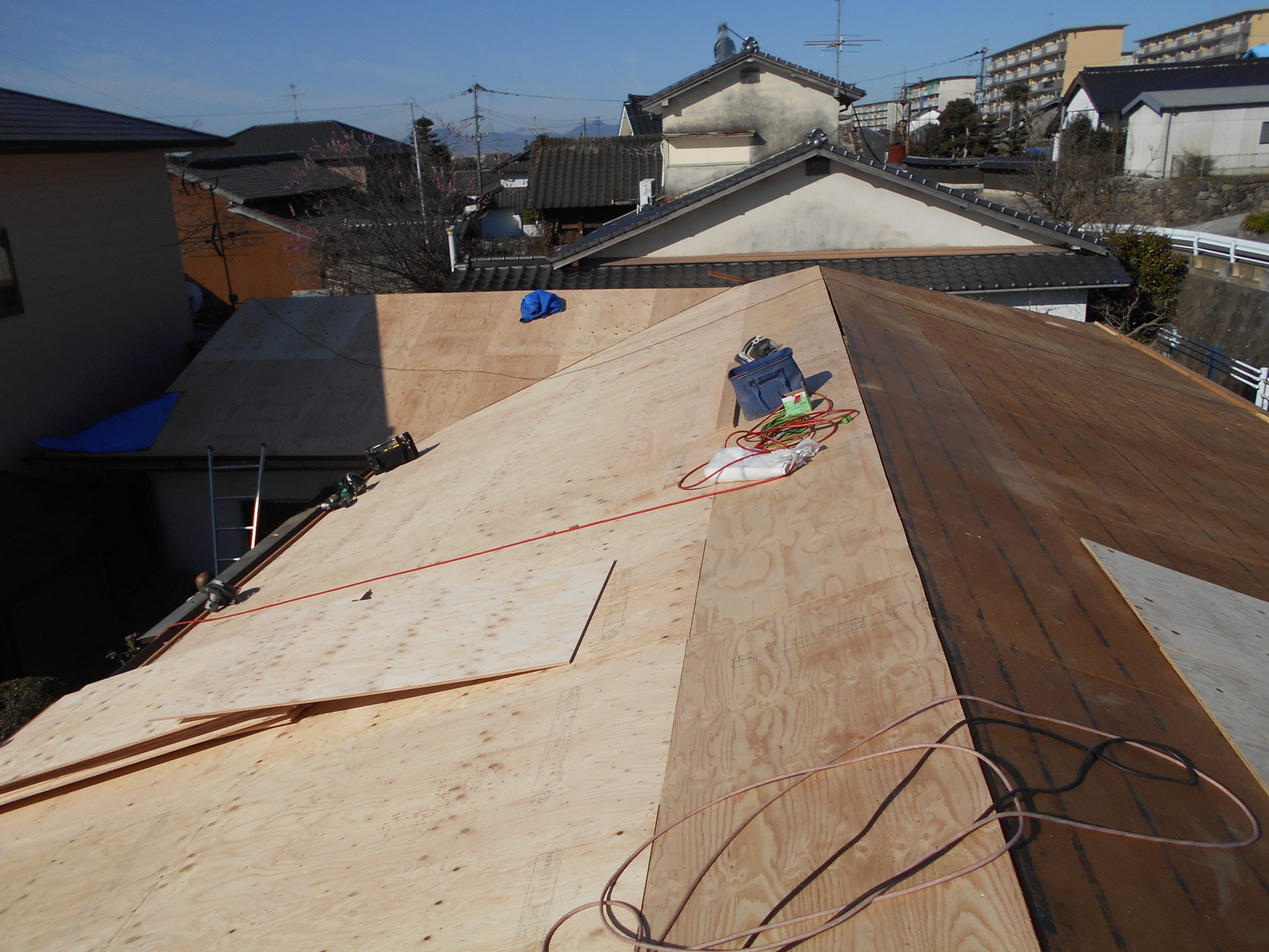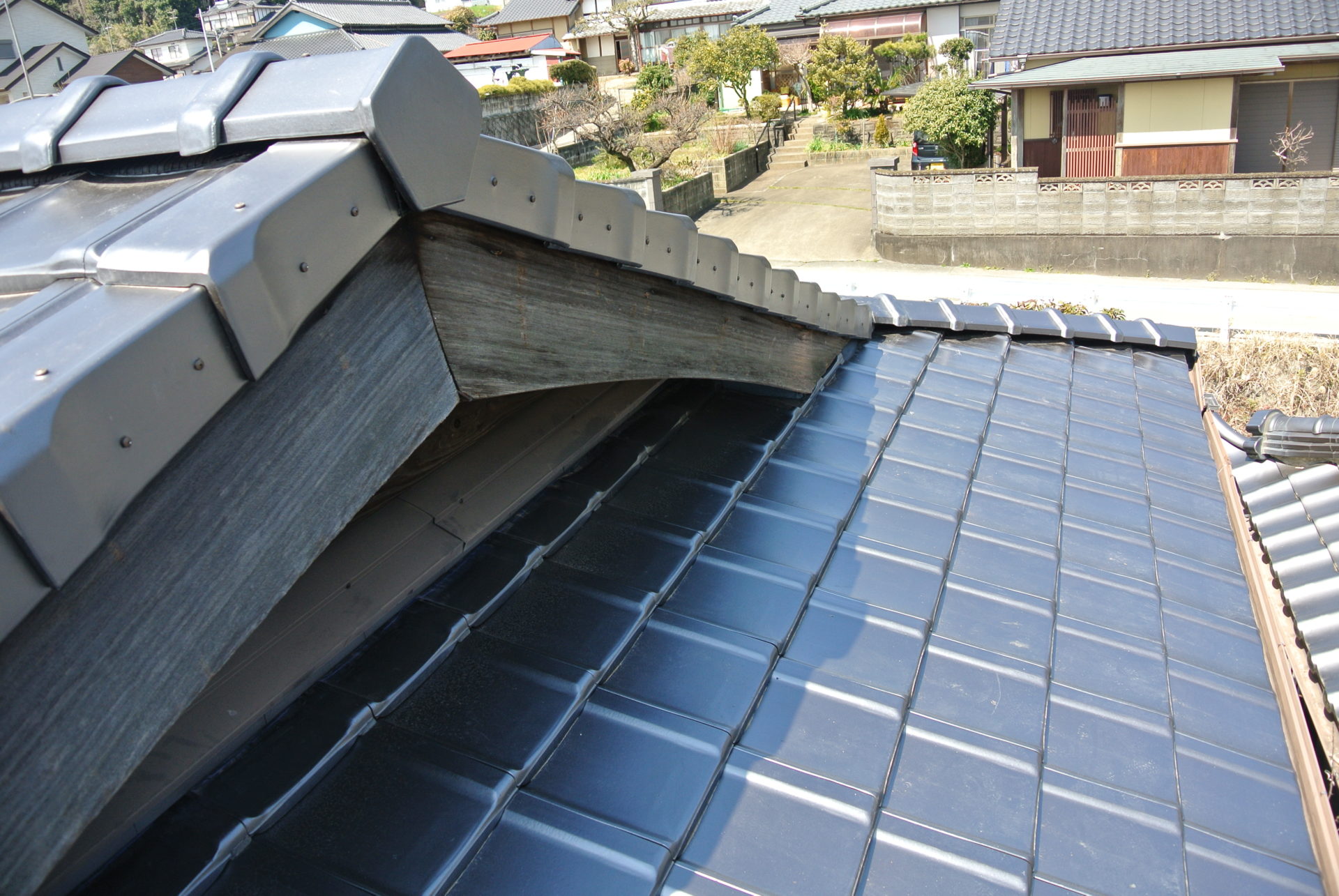 熊本県菊池郡大津町のリフォーム工事を紹介します。 木造・平屋のお家です。 屋根の瓦は釘打ちしていないため棟の瓦は落ち、平瓦もずれていました。 今後の災害に備えて石州の防災瓦へ葺き替えを行っていきます。 棟の瓦は補強の金物を入れて、平瓦同様すべてビスで留めていきます。 今回は下地の野地板の傷みが全体的にひどかったので補強も含めて、上から新しい野地板を重ねて張っていきます。 改修前 (Before) 改修工事中 改修後 (After)