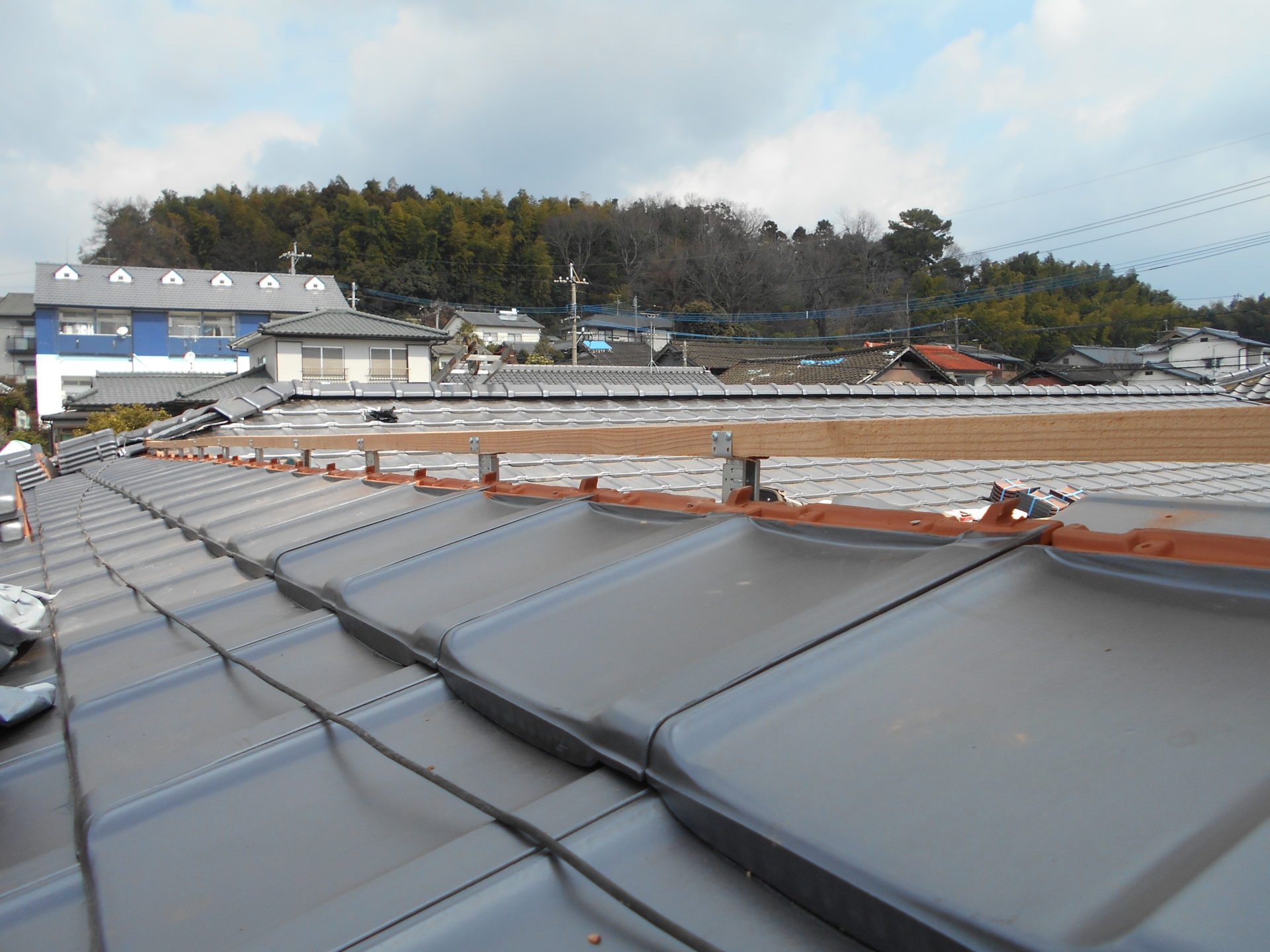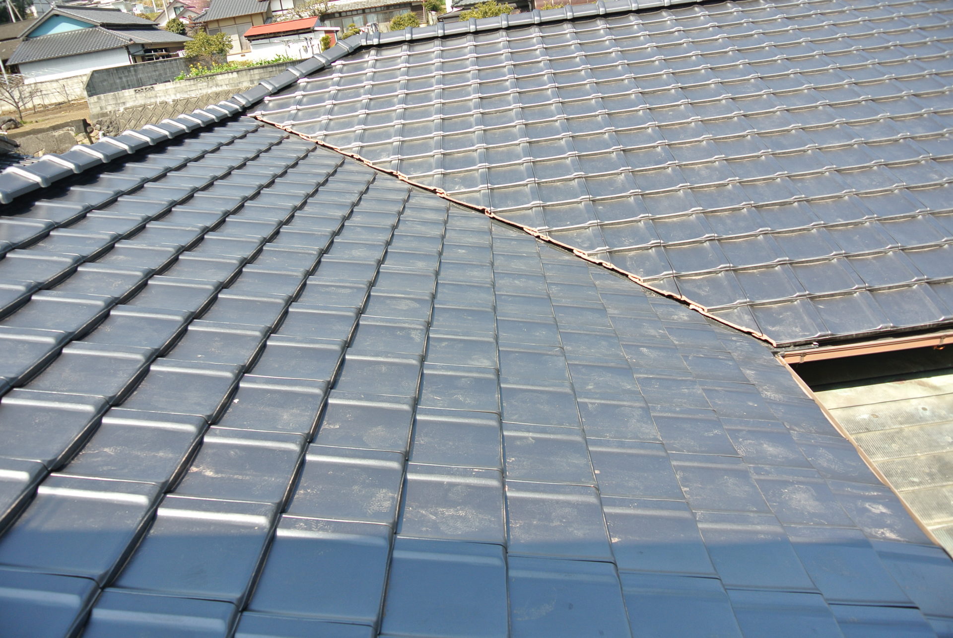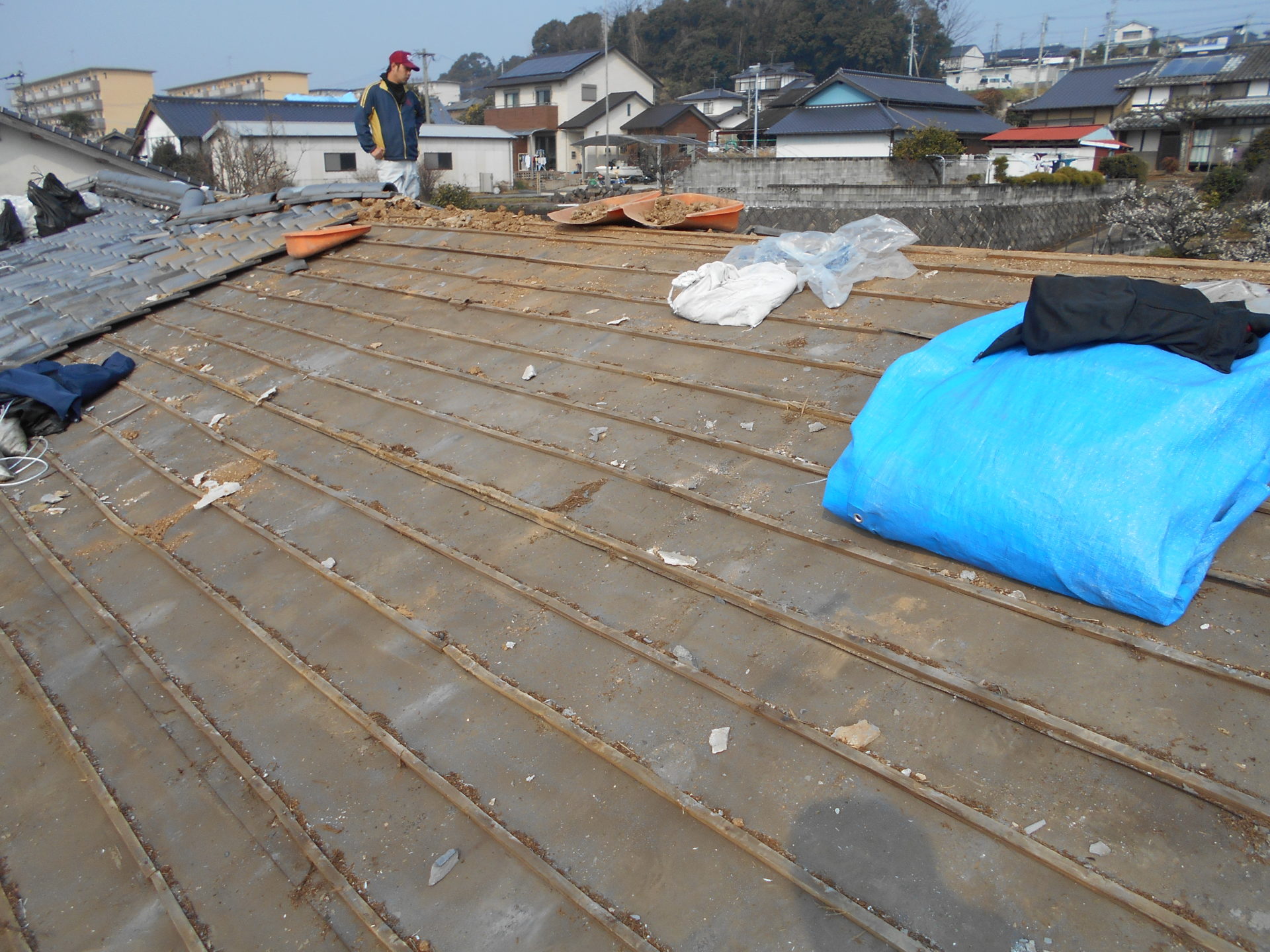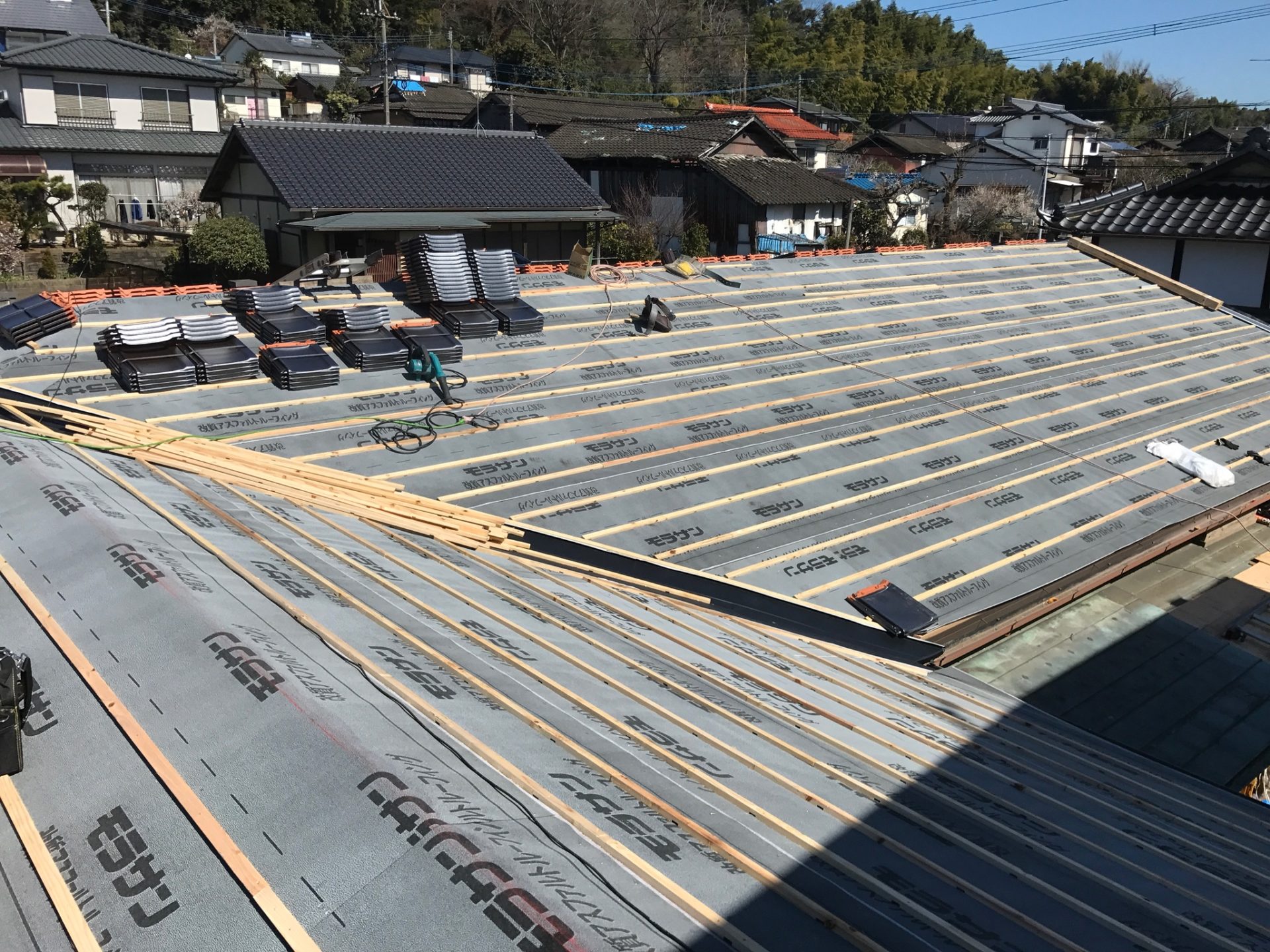 熊本県菊池郡大津町のリフォーム工事を紹介します。 木造・平屋のお家です。 屋根の瓦は釘打ちしていないため棟の瓦は落ち、平瓦もずれていました。 今後の災害に備えて石州の防災瓦へ葺き替えを行っていきます。 棟の瓦は補強の金物を入れて、平瓦同様すべてビスで留めていきます。 今回は下地の野地板の傷みが全体的にひどかったので補強も含めて、上から新しい野地板を重ねて張っていきます。 改修前 (Before) 改修工事中 改修後 (After)
