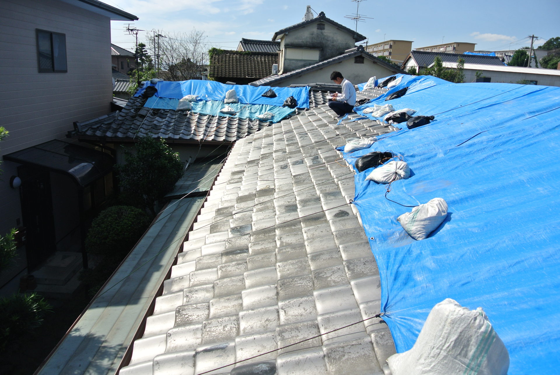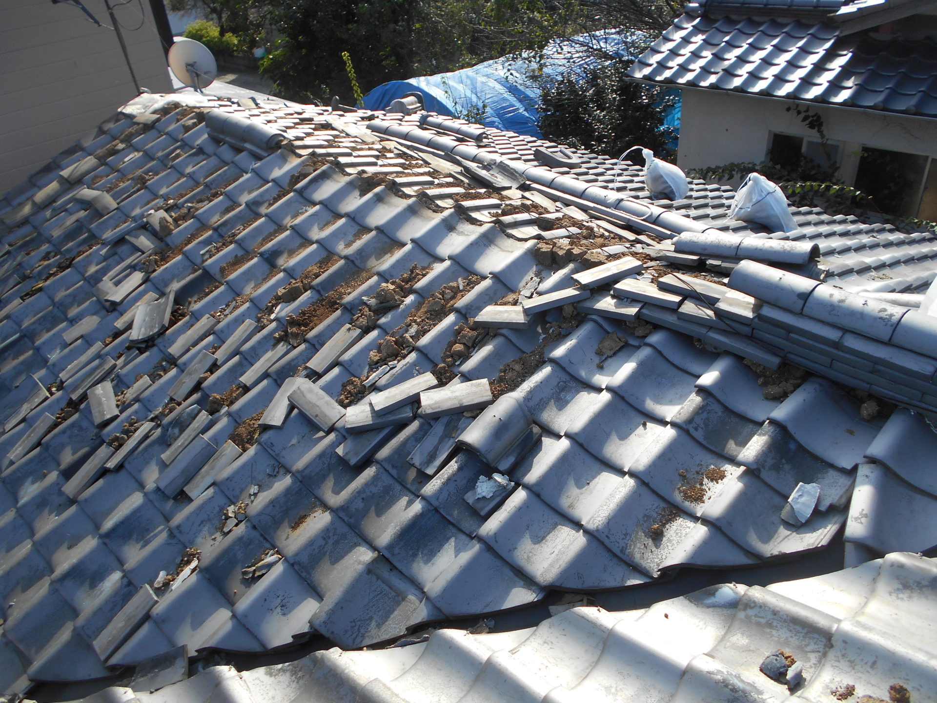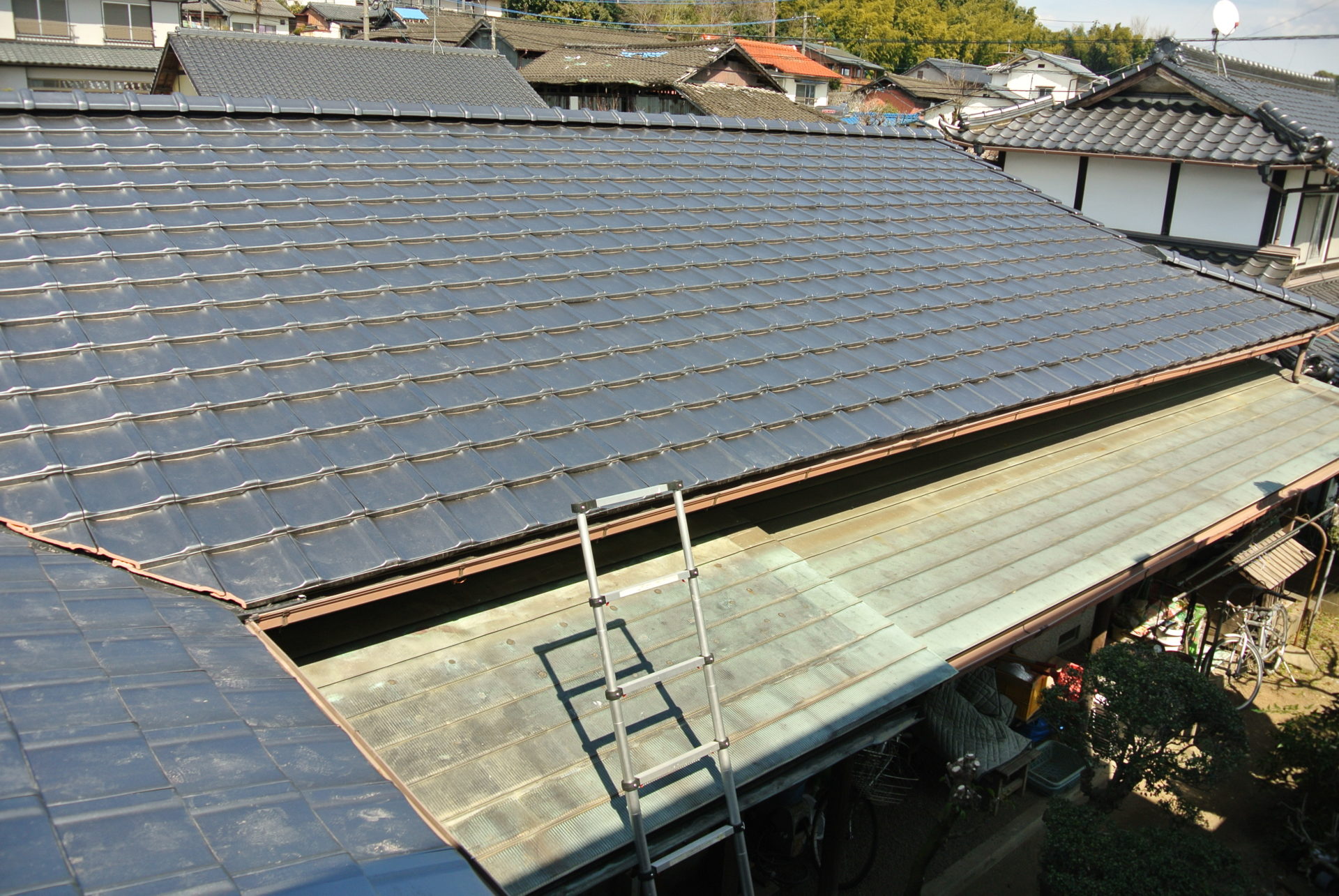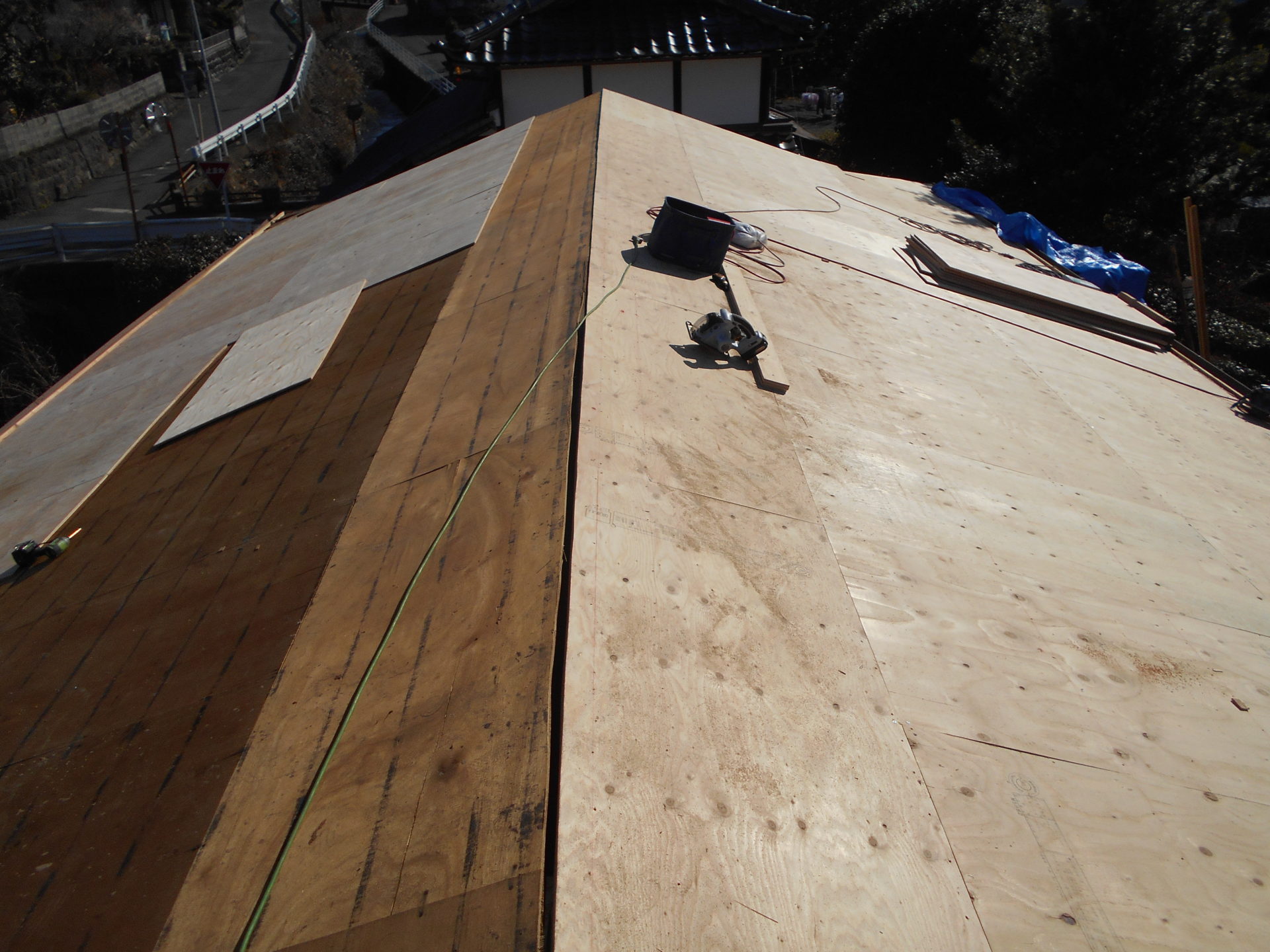 熊本県菊池郡大津町のリフォーム工事を紹介します。 木造・平屋のお家です。 屋根の瓦は釘打ちしていないため棟の瓦は落ち、平瓦もずれていました。 今後の災害に備えて石州の防災瓦へ葺き替えを行っていきます。 棟の瓦は補強の金物を入れて、平瓦同様すべてビスで留めていきます。 今回は下地の野地板の傷みが全体的にひどかったので補強も含めて、上から新しい野地板を重ねて張っていきます。 改修前 (Before) 改修工事中 改修後 (After)