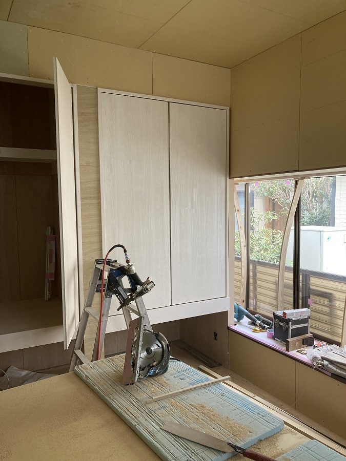 床から浮かせるかたちになったので、収納下にもすぐに使えるものが置けるようになりました。