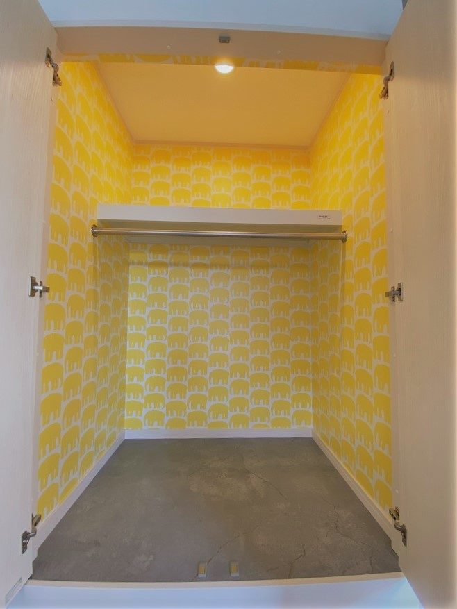 収納内部の壁紙も黄色い象さんの壁紙で遊び心満点に!