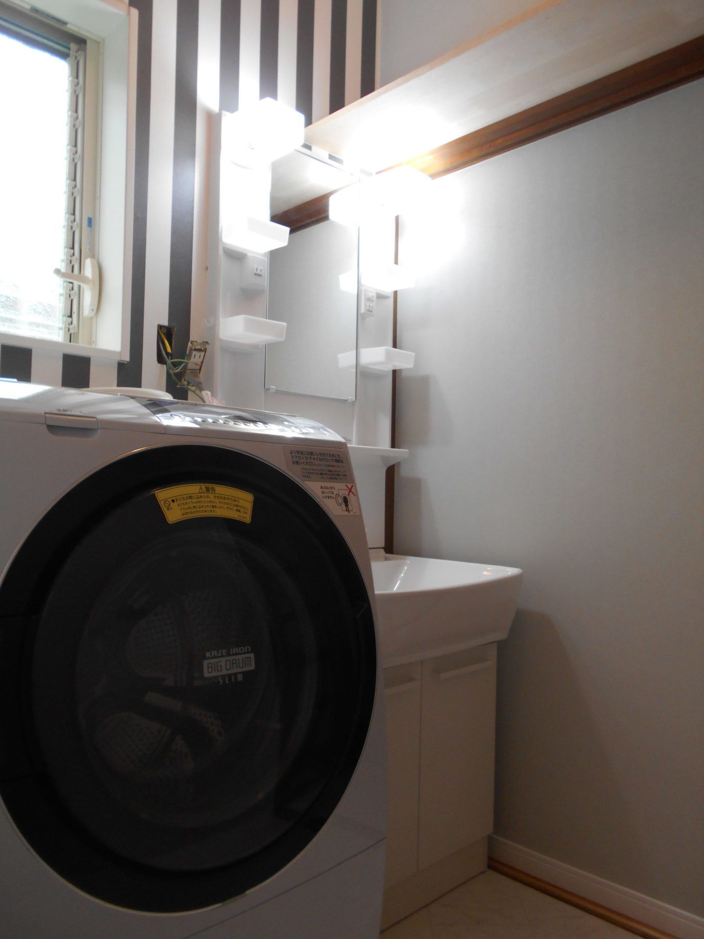 洗面所もアクセントクロスが効いて、すっきりと清潔感のある洗面所になりました。