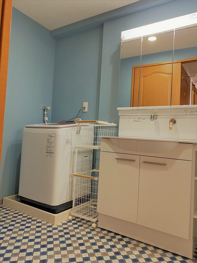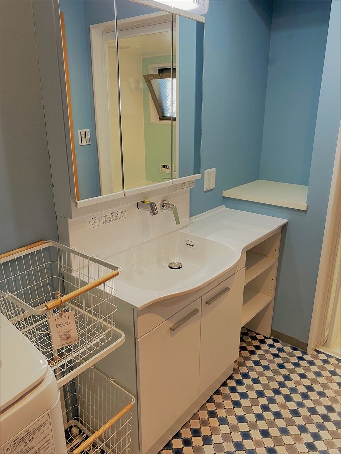 洗面室はお風呂と同系色の青色を基調に清潔感と遊び心のある空間になりました♪