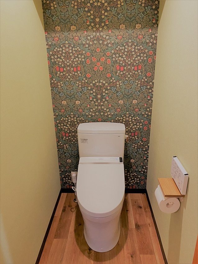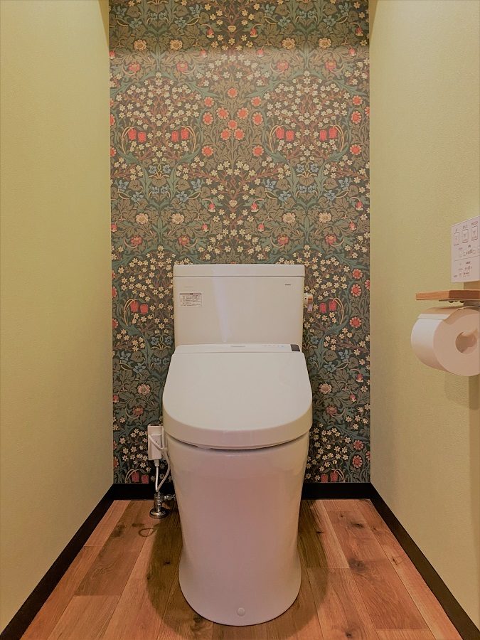 トイレは奥様が一目ぼれされたアクセントクロスを基調に落ち着く雰囲気に仕上がりました♪